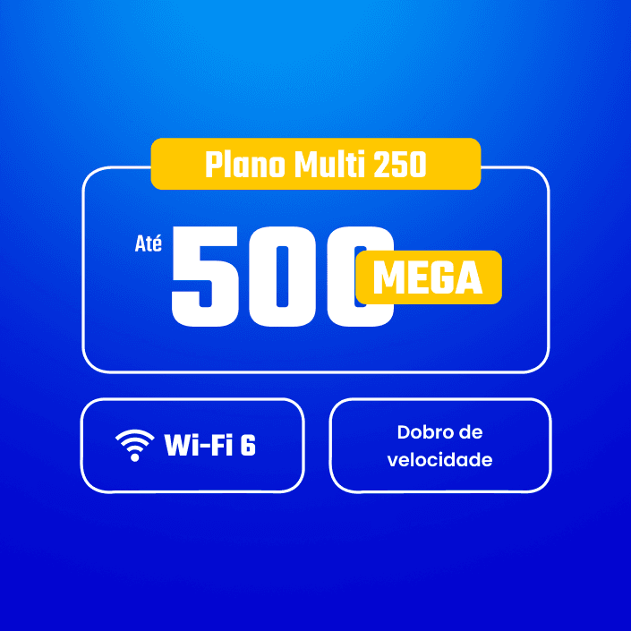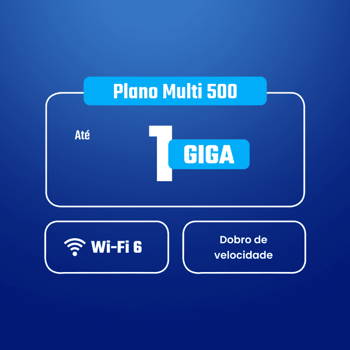 Para quem busca o ápice da velocidade, apresentamos o MULTI 500. Desfrute de uma conexão ultrarrápida com até 1 GIGA de velocidade, perfeita para jogos online, transmissões em 4K e downloads velozes. Conecte-se ao futuro da internet com a potência do nosso plano de MULTI 500.